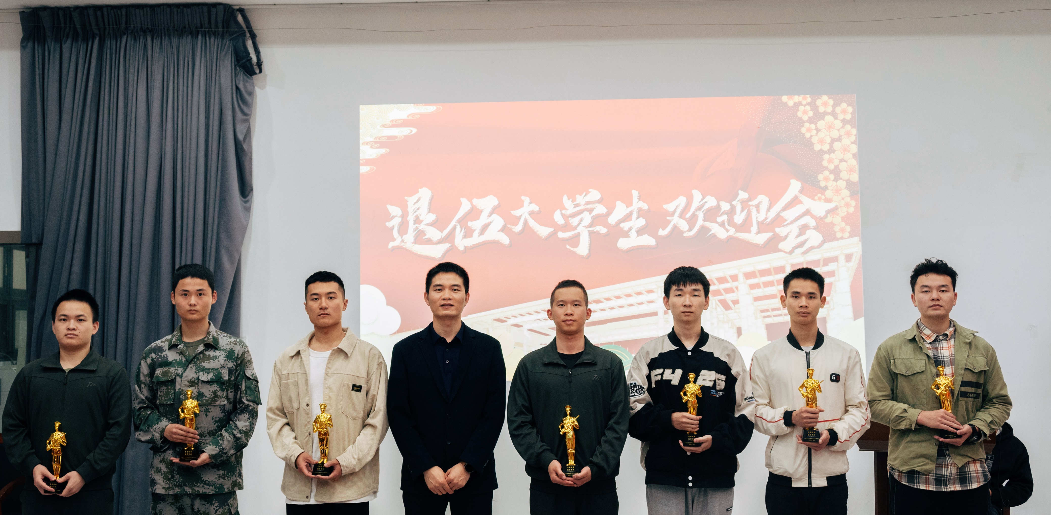 党委副书记杨刚老师为退伍大学生们颁发了纪念品,并鼓励他们保持好在军队的良好生活习惯与优良作风,在社区文化建设与课外活动方面做出更大贡献。