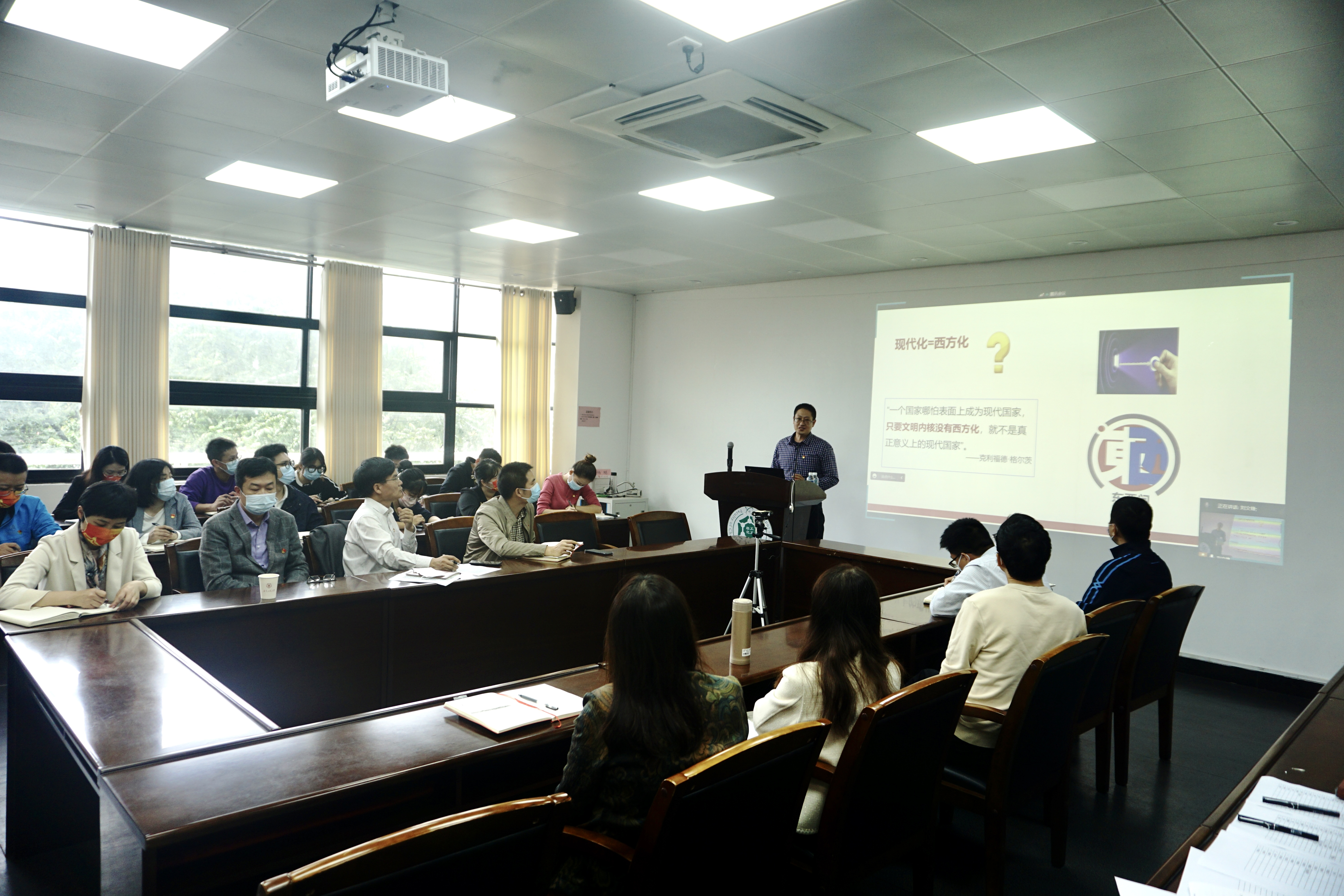 揭晓以《以中国式现代化全面推进中华民族伟大复兴——学习党的二十大精神》为题,分别从中国式现代化的科学内涵及本质要求、中国式现代化的动力、中国式现代化的世界意义三个方面进行阐释。首先,揭晓从西方现代化的理论误区与实践困境出发,指出以资本为中心的西方式现代化在本质上是对立性的,其现代化布局仅仅局限于少数人,注定是一项“未竟的事业”。而中国式现代化开创了一条不同于西方资本主义现代化道路和苏联传统社会主义道路的发展中国家走向现代化的新道路。是中国共产党领导的社会主义现代化。既有各国现代化的共同特征,更有基于自己国情的中国特色。其次,他从中国共产党的领导力、理论指引力、价值引领力、文化内蕴力四个方面详细阐述了中国式现代化的四重动力。最后,他指出中国式现代化有利于丰富世界现代化道路的多样性,超越西方式现代化模式;有利于营造公道正义、共建共享的安全格局;有利于打造合作共赢、共同繁荣的新世界。揭晓教授的辅导报告主题鲜明、视野开阔、分析透彻,对全院师生深刻领会党的二十大精神具有很强的指导意义。
