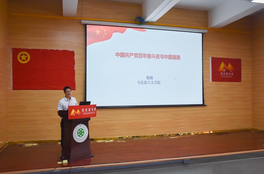 揭晓教授以“学党史 守初心 担使命——学习中国共产党百年辉煌史”为主题和大家一起重温中国共产党的百年奋斗史和中国道路。他从习近平总书记关于学习党史的重要论述、中国共产党百年奋斗主题路线、毛泽东开辟中国特色的革命道路、社会主义革命和建设的兴国之路、改革开放与富国之路、新时代的强国之路这六部分展开讲述,他通过详实的史料、形象生动的语言表述,让一个个鲜活的故事和人物带领大家一起见证中国共产党的成长过程,见证中华民族的崛起历程,并让大家能够在学习党史的过程中以史照今,胸怀“两个大局”,肩负起新时代赋予广大党员和青年的责任与担当。
