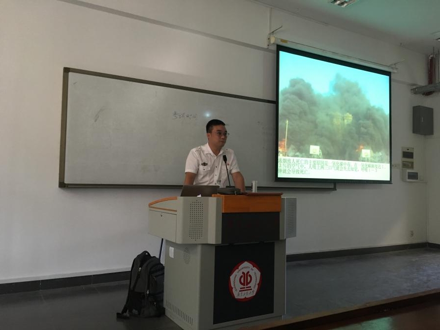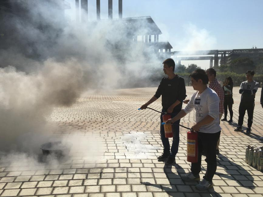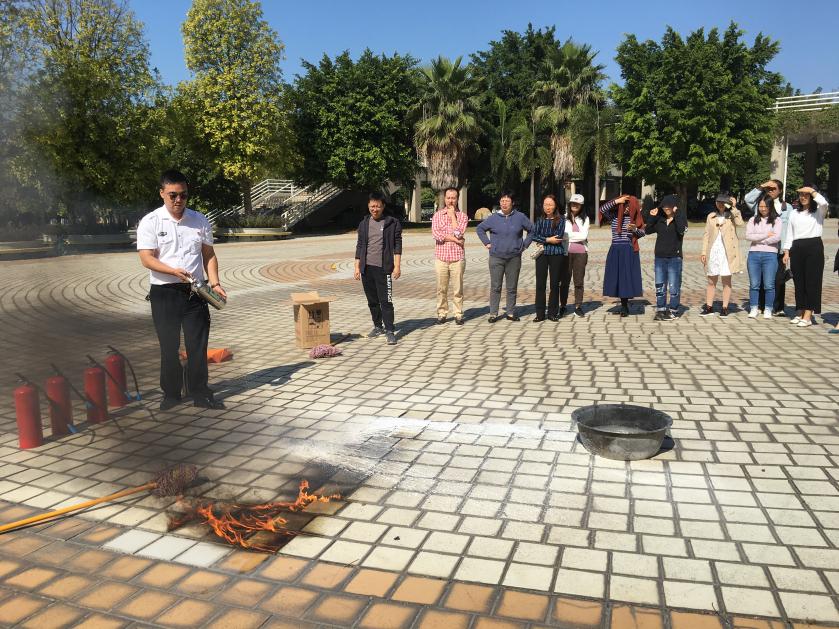 李军民教官通过PPT和视频为大家进行约40分钟的消防安全知识培训,因消防安全知识缺乏而自救不及时的典型案例,现场触目惊心让师生们深刻感受到火灾的无情及掌握消防知识的重要性;同时李教官根据每个事故给予正确的逃生指导:逃生路线、应急措施、灭火器、防烟面具使用等,师生们受益匪浅。培训结束后在图书馆前小广场空地进行灭火现场演练,教官现场详细介绍了干粉灭火器和水基灭火器的正确使用方法,师生们在李教官及保卫处梁科长的指导下每位参加培训的人员都进行了灭火演练。