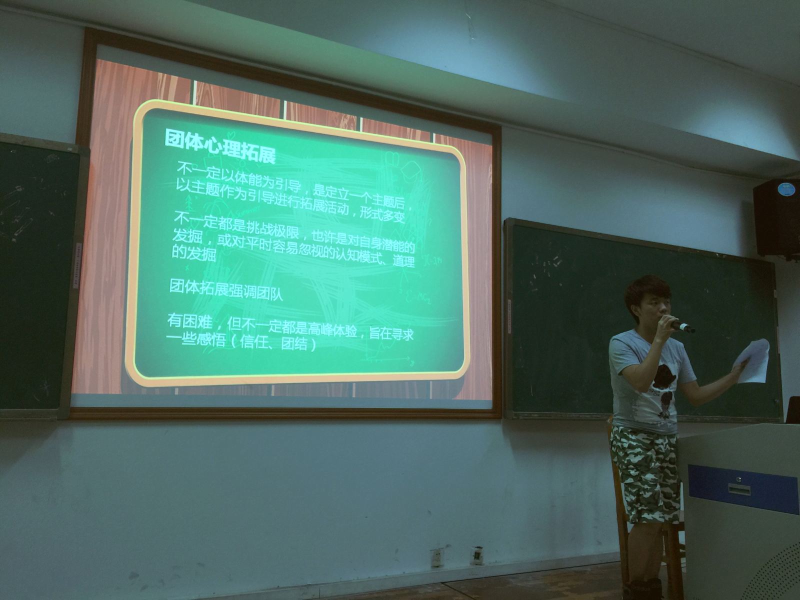 培训过程中殷健老师为大家讲解了何为团体拓展、如何设计团体心理拓展以及注意事项。所谓团体拓展,就是通过组织、开展精心设计的集体活动,使参与者在“虚拟”而安全的环境中产生真实的情绪体验,进而领悟到拓展师要传达的理念。其目的是借助体验式培训作为媒介手段,用于提高受训人员心理素质和心理健康水平。其意义在于:1、提高学习工作效率;2、提高实际作业能力;3、提高心理健康水平;4、培养良好的行为应对模式和认知模式;5、认识群体作用,增进对集体的参与意识和责任心;6、改善人际关系,学会关心,更为融洽的与群体合作。设计团体心理拓展时要注意:1、方案设计要以成员为中心,以成员成长为目标;2、方案设计要体现团体心理辅导功能的拓展和延伸,不能仅仅局限于辅导情景中,还应拓展到辅导情景外,能够进行有效迁移;3、团体活动安排要适当,活动结束后及时组织、引导成员进行分享讨论,切记在方案设计中活动堆砌,为活动而活动。