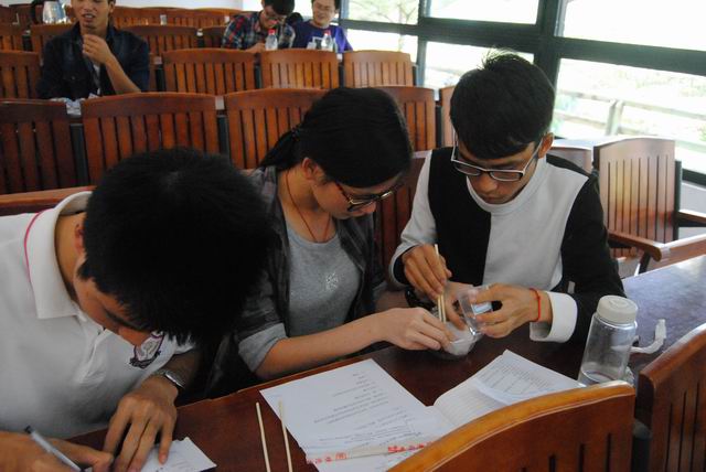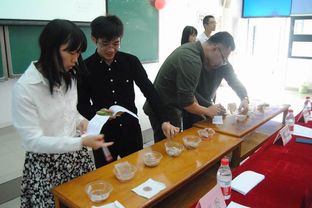 钟泽钦,钟本镔,刘彦兰,卓少春等优秀研究生代表担任评委。决赛分三轮,采用积分制。比赛中,参赛队员被要求在规定时间内选择适当的生活用品与药剂来处理生活中的各种化学难题,并解答其中的化学原理。比赛现场气氛愈发热烈,各参赛选手团结协作,运用丰富的知识和敏捷的思维过五关斩六将,比赛渐渐进入白热化状态。而互动环节中的化学知识抢答及生活化学趣味实验的展示更是使现场气氛达到了一个至高点。最终,东四421作战小分队获得了三等奖、夜空流行队获得了二等奖、SSW队则凭借出色的表现获得了一等奖。