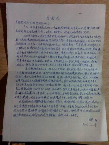 我感谢所有捐款现款的老师同学们,感谢你们的爱心捐助,是你们给了我重新拥有生命和美好人生的希望!在此,我及我家人向所有奉献爱心的人们致以最诚挚的谢意!谢谢你们!最后,请允许我向所有关心与资助过我的老师及同学们深深地鞠躬,并祝好人一生平安。
