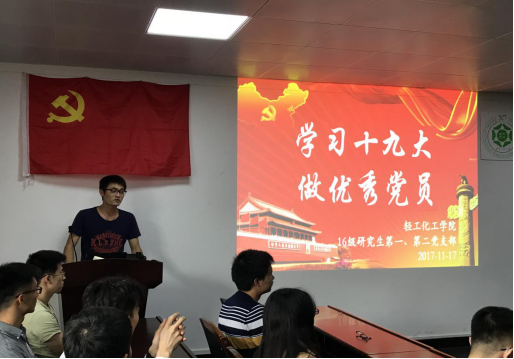 之后,2016级研究生第一党支部魏浩同志、16级研究生第二党支部李文奎同志分别就学十九大会议精神,争做优秀青年党员学习十九大,做优秀党员做了主题演讲。魏浩同志结合自身平时科研小事情讲述了自己如何在日常生活中学习、实践十九大会议精神,分享自己作为一名党员同志在生活中怎么约束自己、锻炼自己、积极向党组织靠拢,做真实的自己,抵制诱惑,承担个人责任。不忘初心,砥砺前行,李文奎同志从十九大主题思想讲到十九大会议精神,着重讲述了作为一名中国共产党党员应该如何从自身出发,向榜样看齐,学习榜样的力量。一名优秀的研究生党员应该做到勤于思考、善于钻研,对工作、学习、生活尽职尽责,兢兢业业的拼搏。