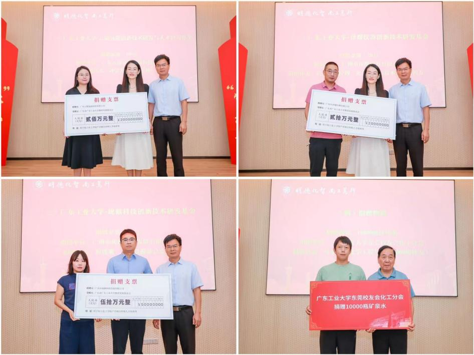 会上,广东云韬氢能科技有限公司、广州市珑麒科技发展有限公司、广州市泽耀仪器有限公司分别向live007比分 进行了捐赠,捐赠款项用于live007比分 产学研合作和人才培养等。学校东莞校友会化工分会向live007比分 捐赠了10000瓶饮用水,用于庆祝学校本科办学65周年主题系列活动。