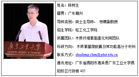 陈树生,博士,广东工业大学"青年百人"A类特聘副教授、硕士生导师。2012年获中山大学学士学位,2015年获复旦大学硕士学位,2015-2018年任职于一汽-大众汽车有限公司佛山分公司(积累了对汽车内外饰材料的"吐槽"素材),2022年获香港科技大学博士,并于香港中文大学(深圳)访学(完成除京城外中国主要大城市打卡)。现主持国家自然科学青年基金、广东省自然科学基金面上项目等科研课题8项(学术圈摸不了鱼,只能硬核输出),致力于木质纤维素高值化利用领域的前沿研究。在Advanced Functional Materials(材料学顶刊界三好学生), Chemical Engineering Journal(化工领域的速度之星), ACS Sustainable Chemistry & Engineering(可持续材料研究者的打卡圣地)等期刊共发表SCI论文二十余篇。